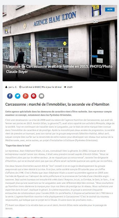 Dans sa rubrique "Economie & Immobilier" le journal quotidien L'indépendant revient sur le grand retour d'Agence Hamilton à Carcassonne, au 30 rue Antoine Armagnac. Dans des locaux rénovés et pensés pour vous acceuillir dans un esprit convivial, chaleureux, porté sur l'humain, vos conseillers en immobilier urbain, de caractère et de prestige vous attendent pour répondre à vos demandes et vous présenter leurs maisons de caractère, de ville, châteaux et belles demeures à Carcassonne.