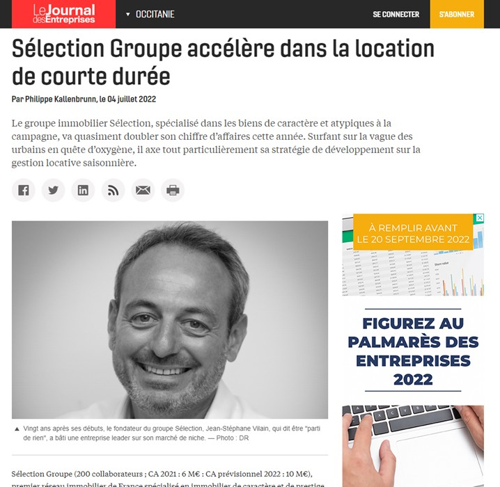Dans sa rubrique Entreprises, la Gazette Du Midi revient sur les 20 ans de Selection Groupe et présente son offre à 360° dans la vente d'immobilier de caractère et de prestige depuis 2002. Transaction, courtage en prêt et travaux, service de conciergerie, gestion locative saisonnière...