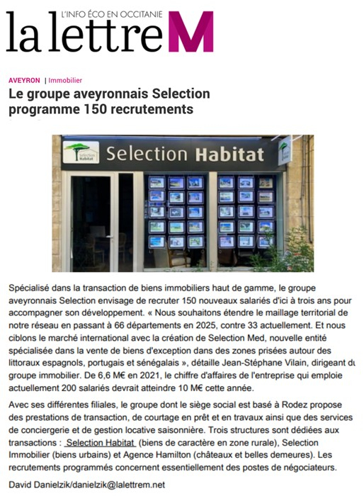 Dans sa rubrique immobilier, La Lettre M met en lumière Selection Groupe et son programme de recrutement de 150 négociateurs d'ici 3 ans pour accompagner son développement sur l'ensemble du territoire jusqu'à la côte méditerranéenne et vous offrir une expérience immobilière à haute valeur humaine.
