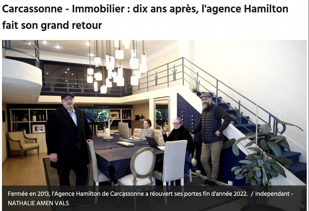 Dans sa rubrique "Economie & Immobilier" le journal quotidien L'indépendant revient sur le grand retour d'Agence Hamilton à Carcassonne, au 30 rue Antoine Armagnac. Dans des locaux rénovés et pensés pour vous acceuillir dans un esprit convivial, chaleureux, porté sur l'humain, vos conseillers en immobilier urbain, de caractère et de prestige vous attendent pour répondre à vos demandes et vous présenter leurs maisons de caractère, de ville, châteaux et belles demeures à Carcassonne.