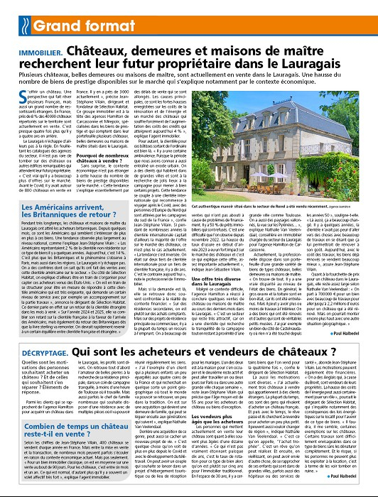 Interviewé par le journaliste William Upton pour The Connexion, Jean-Stéphane Vilain, fondateur de Selection Groupe & Agence Hamilton revient sur l'année écoulée. Malgré une légère baisse des ventes sur l'année 2023, il précise que le marché des châteaux reste stable.